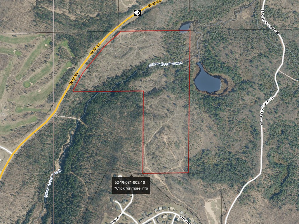 The heavily wooded recreation or potential development land is in the southwest corner of West Branch Township in Marquette County. Silver Lead Creek flows through the valley of its rolling hills and is fed by Little Trout Lake to the West.