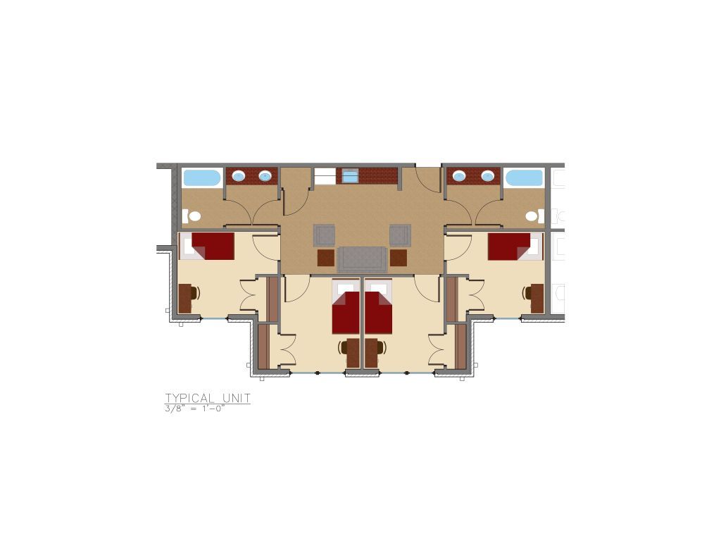 Unique Floor Plan Designs, On Site Laundry Facility, Access to Cable TV in Each Suite as Well as Each Bedroom, Each Suite has its Own Designated Telephone Number, Fully Equipped Kitchenettes with Refrigerators, Microwaves and Stainless Sinks, Furniture Provided (Including Bed, Desk, Desk Chair in Each Bedroom and Sofa, Chairs and Tables in Each Suite), Utilities Included: Water/Sewer, Electric, Cable and Internet, Telephone, Exterminating and Garbage.